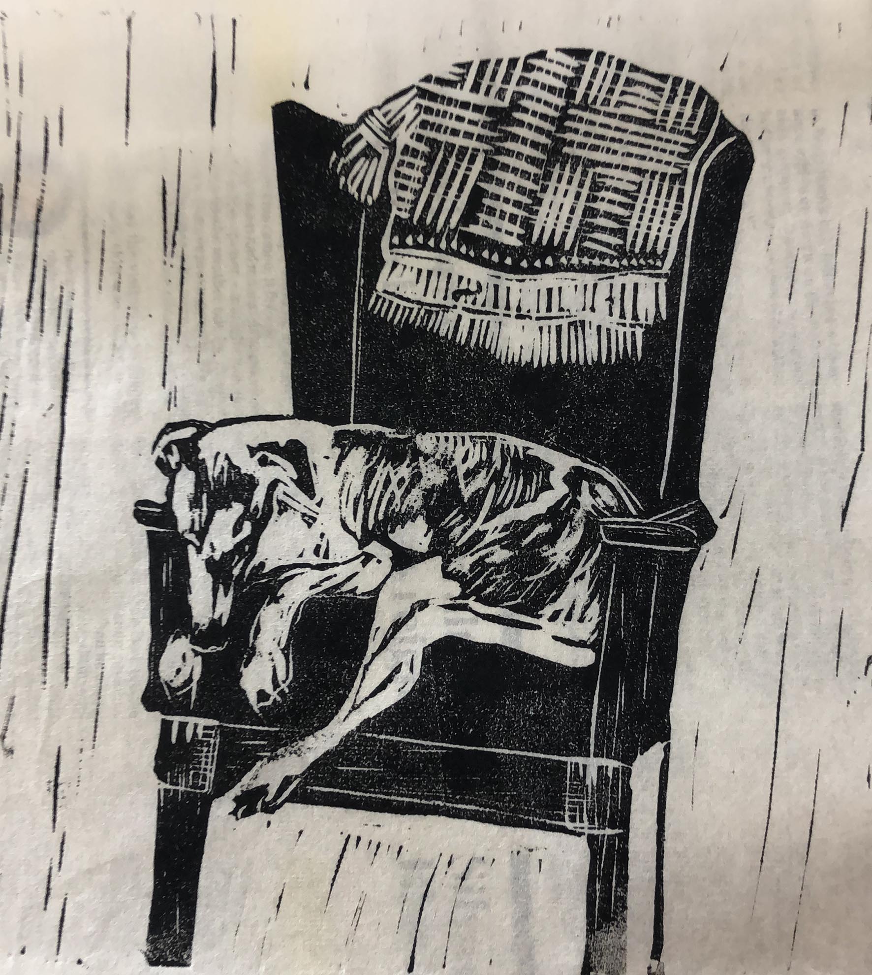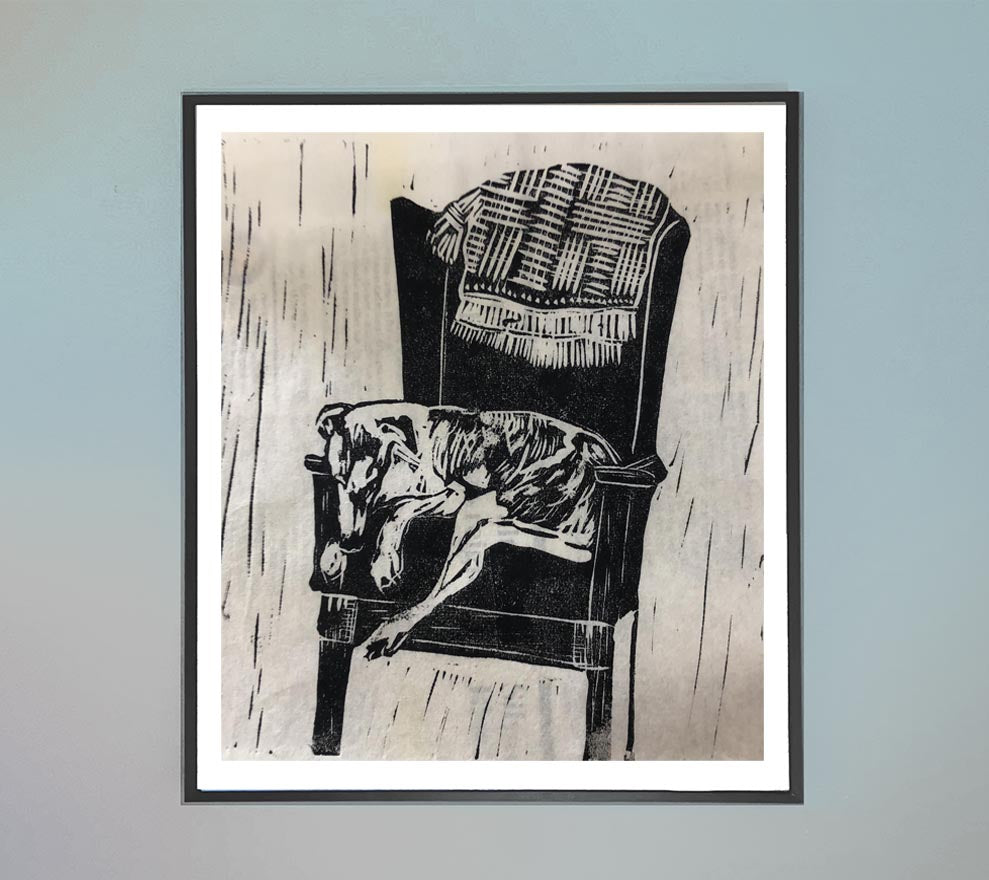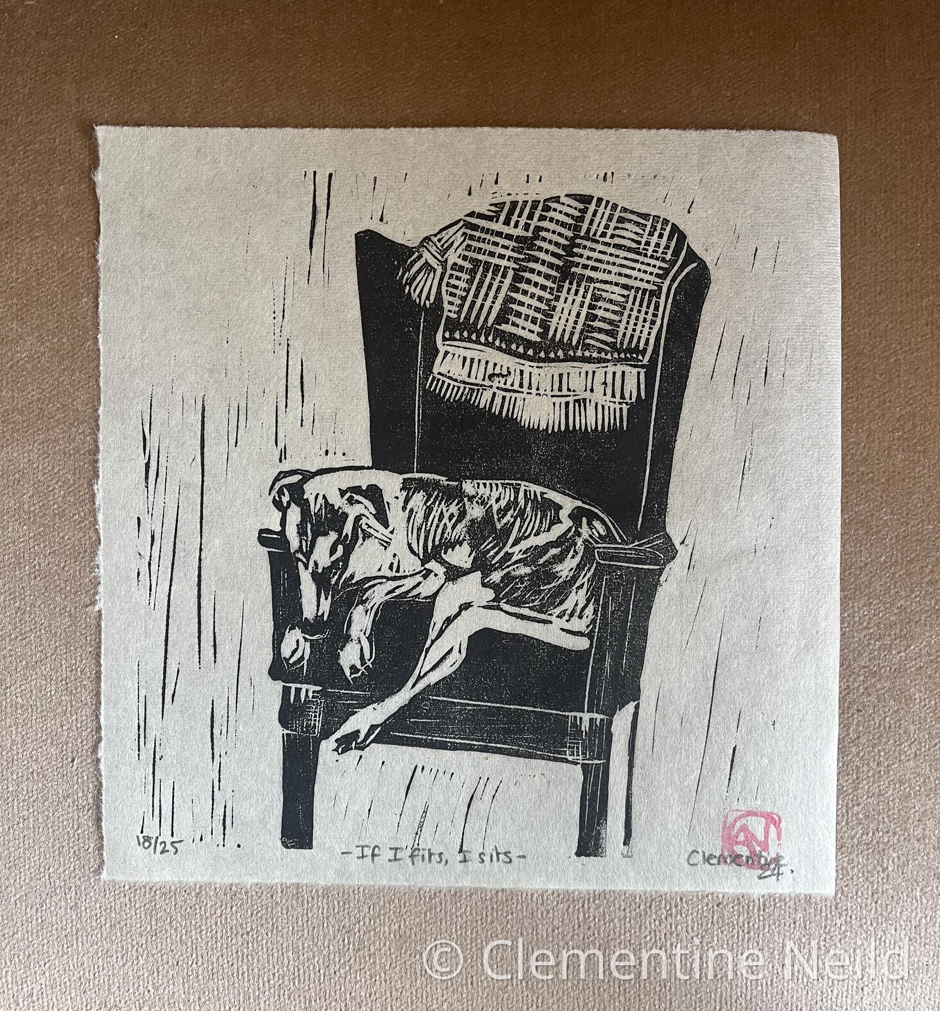 If I Fits, I Sits is named for the funny things our pets do to find a comfy spot in the house. My lurcher likes to sit in the sun and I captured this image of him curling his leggy form into my Grandmother's chair.