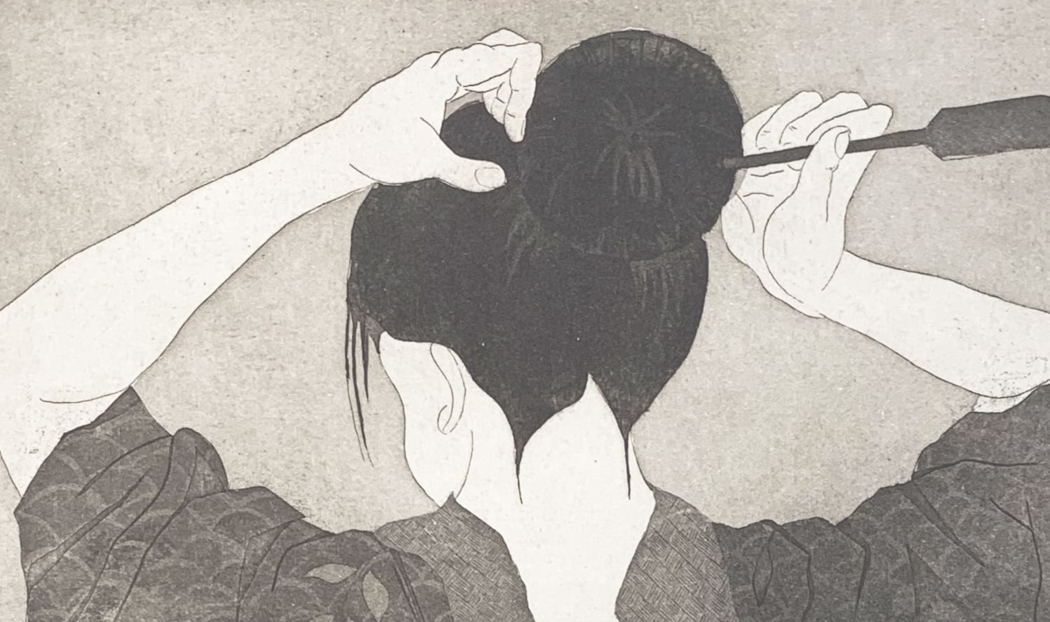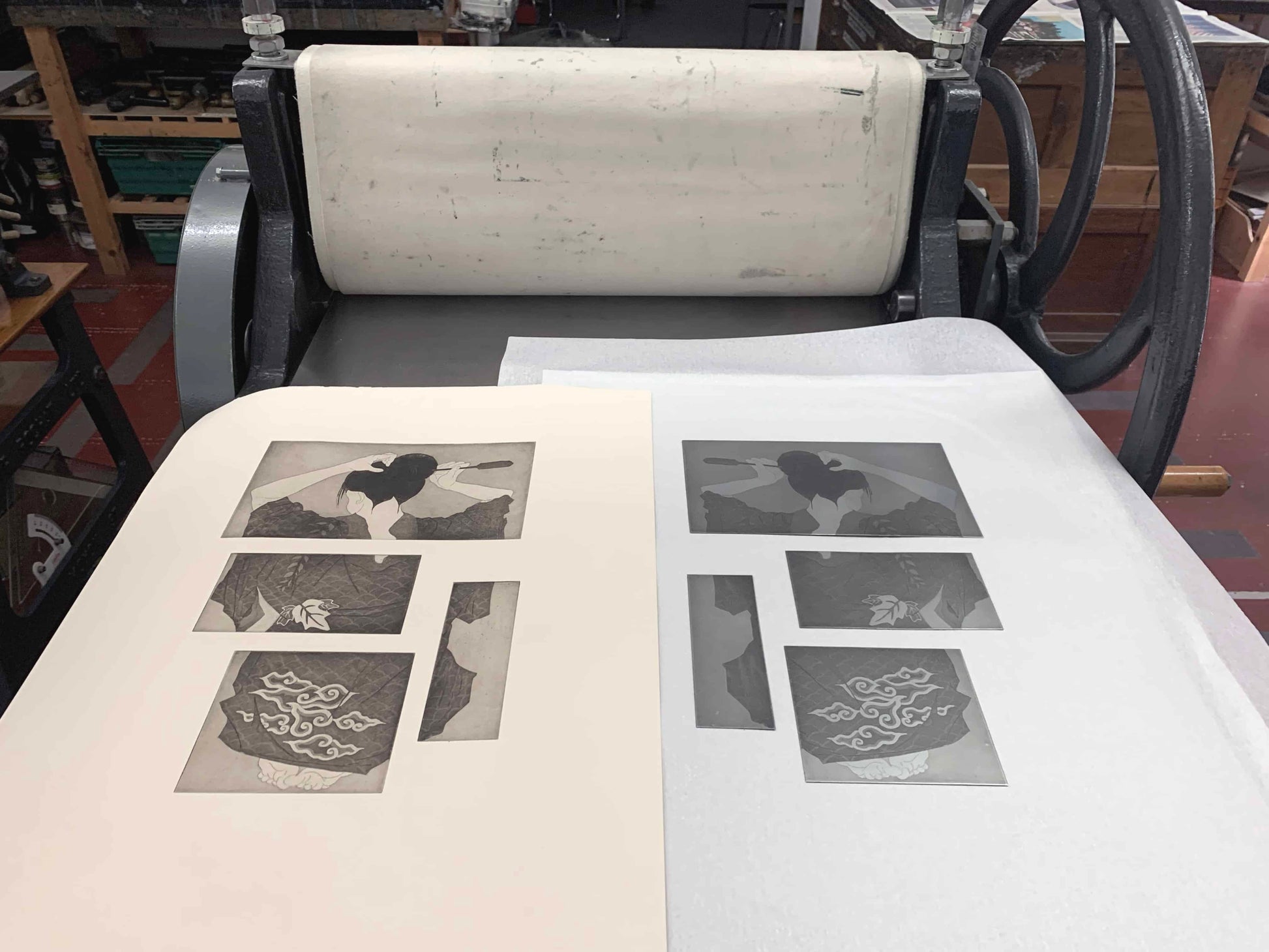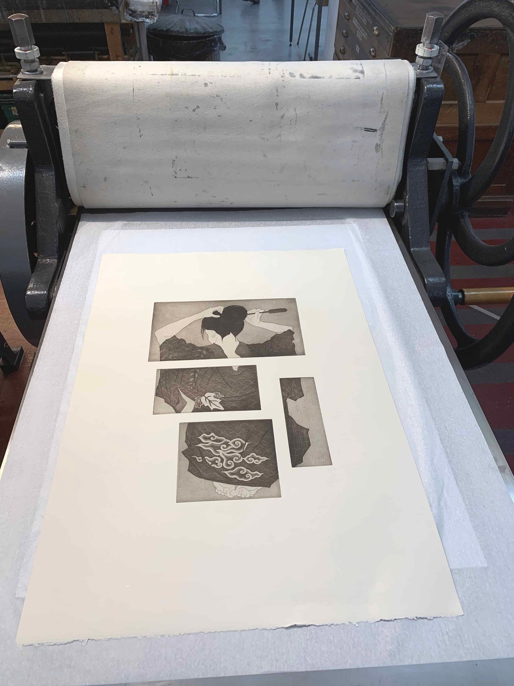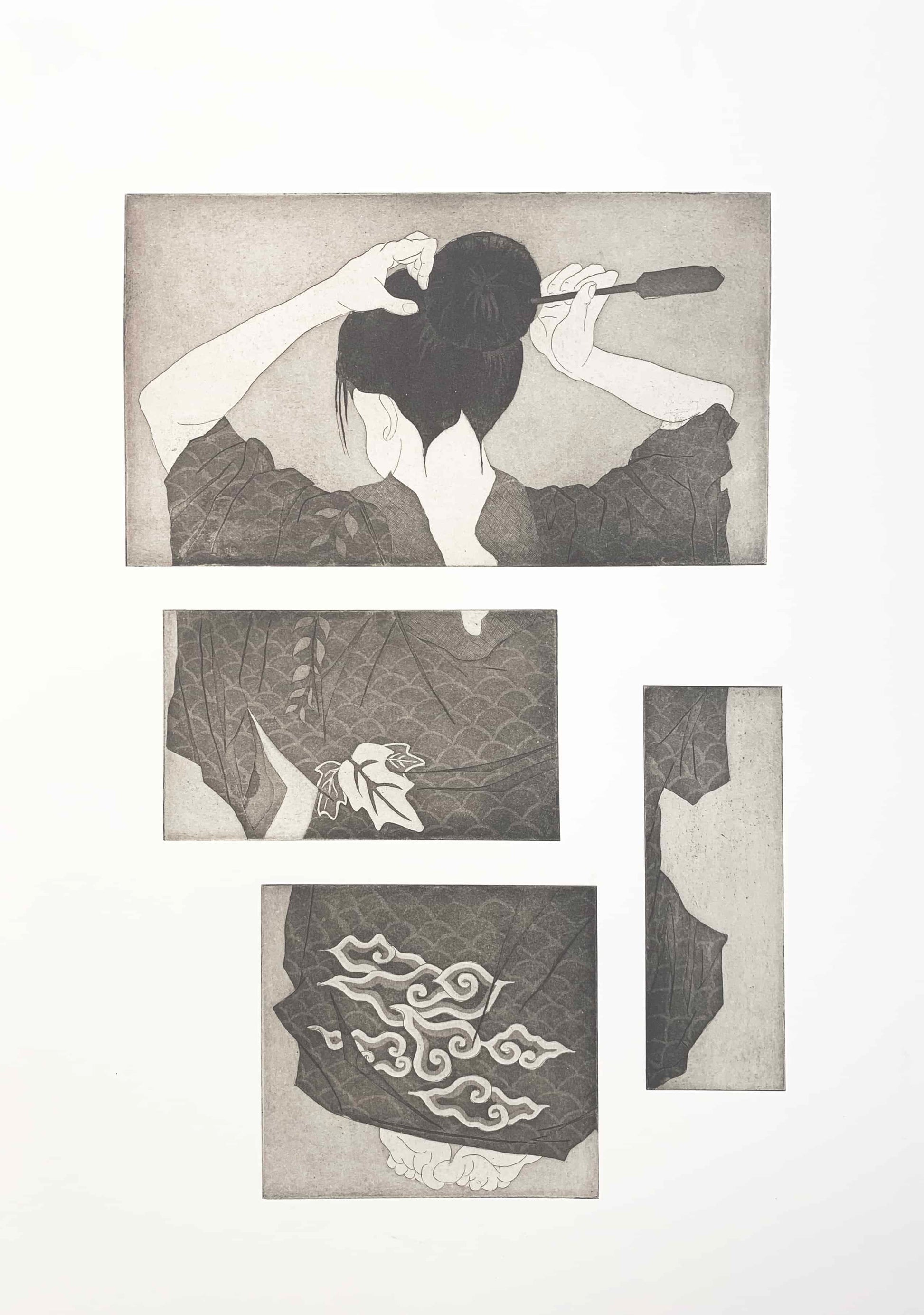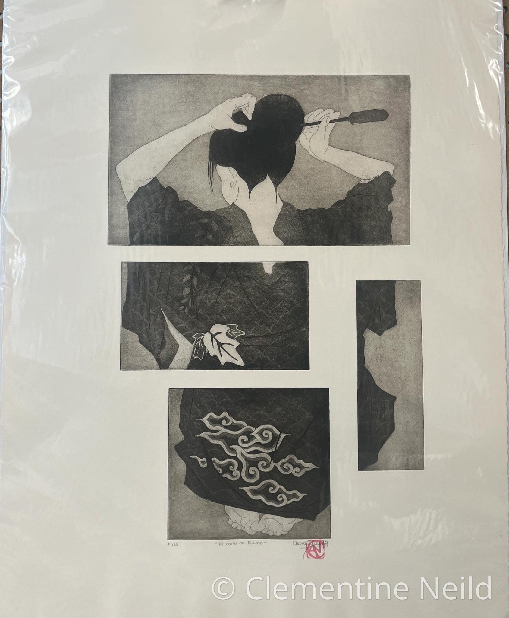 Kimono no Kumo translates as Kimono with clouds. This 4 plate print is a self portrait in a kimono I was given when I was at university. It is one of the first prints I completed. The split plate was because I was thinking about manga comics and the ideas of beauty in the Japanese aesthetic.