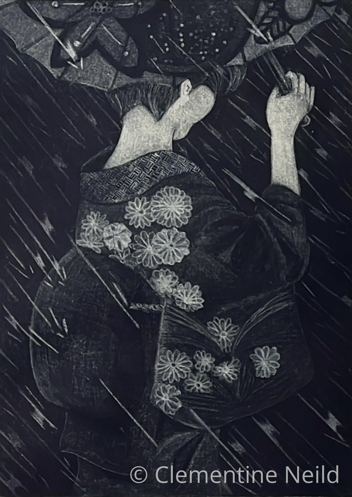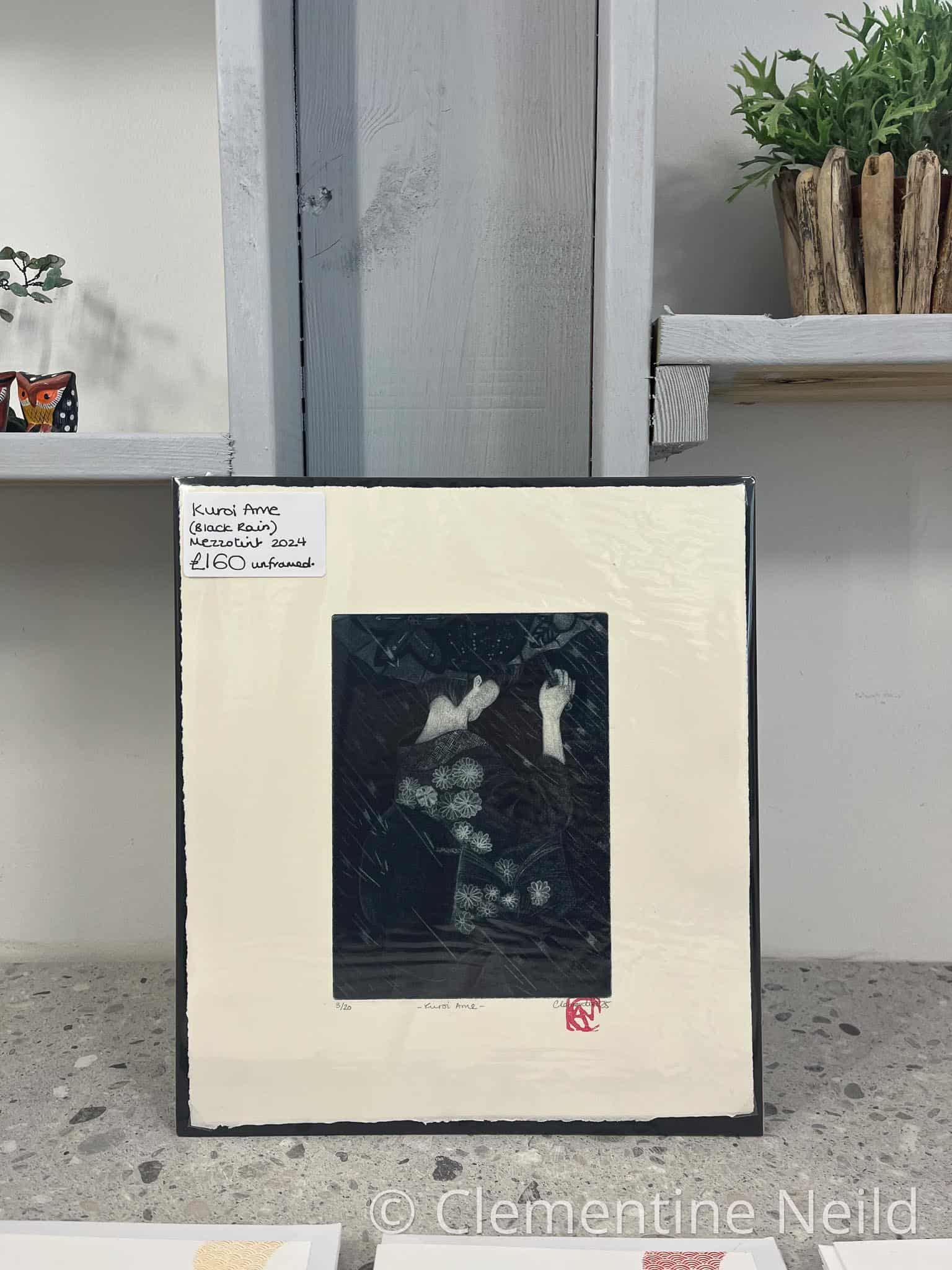 Mezzotint is an acid free process that involves the artist 'rocking' a copper plate with a specialist tool to rough the surface of the copper up enough to ensure that when it is inked in the printmaking process it holds, and prints, a rich deep black. At this point the plate is ready to be burnished to bring out the image. Burnishing involves polishing the rough surface with a small ballpoint tool. The smoother the final mark; the whiter the final mark will print.