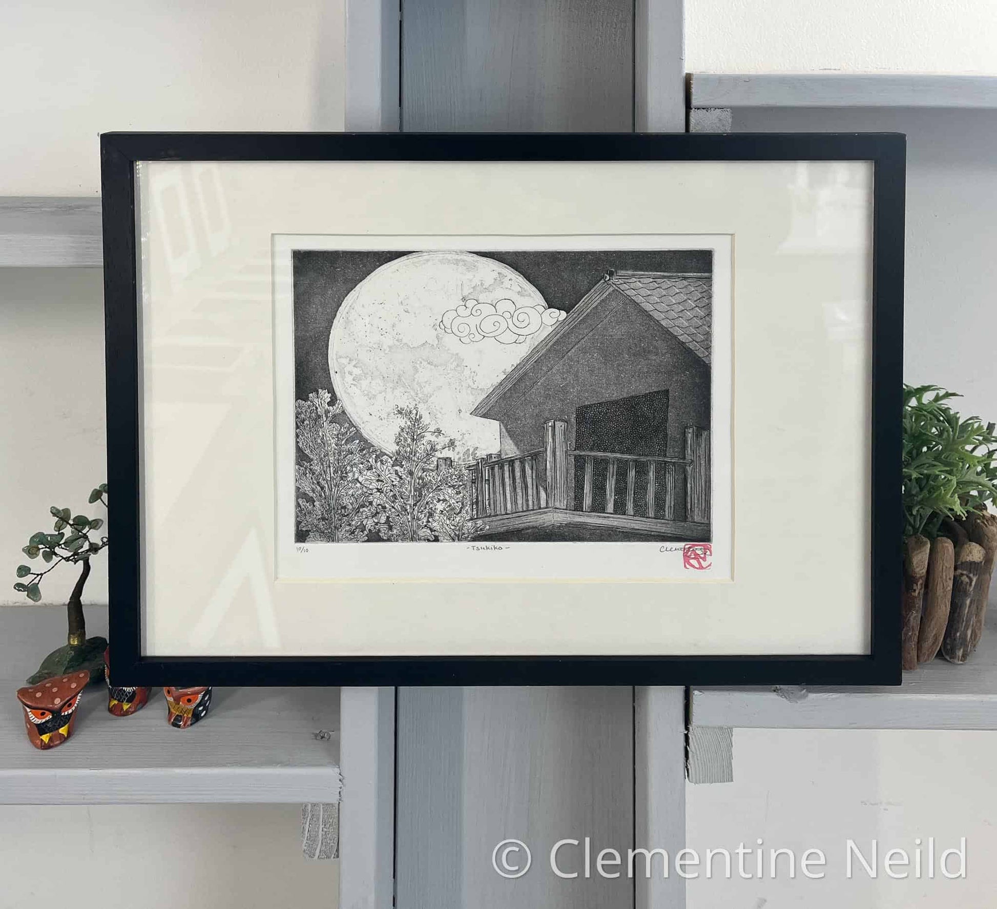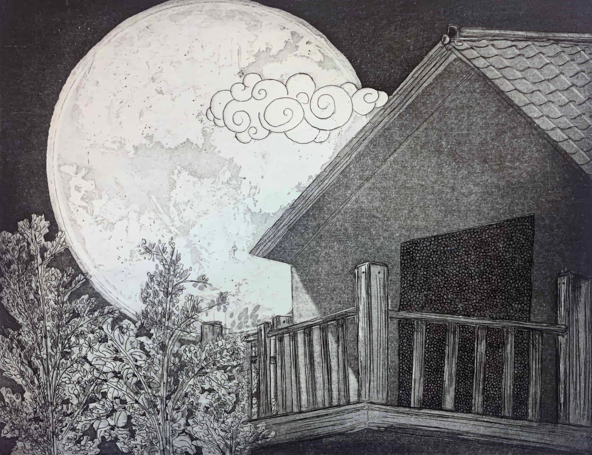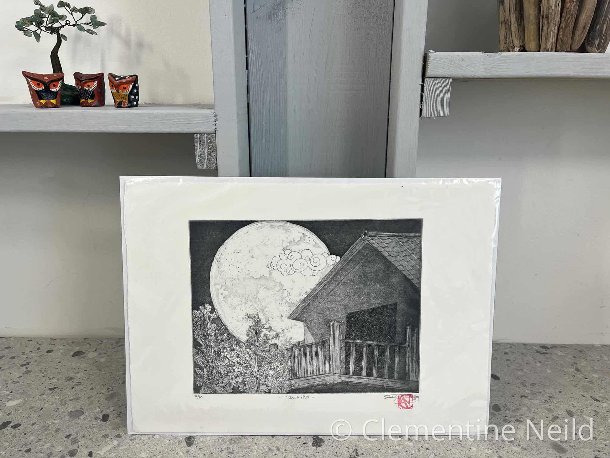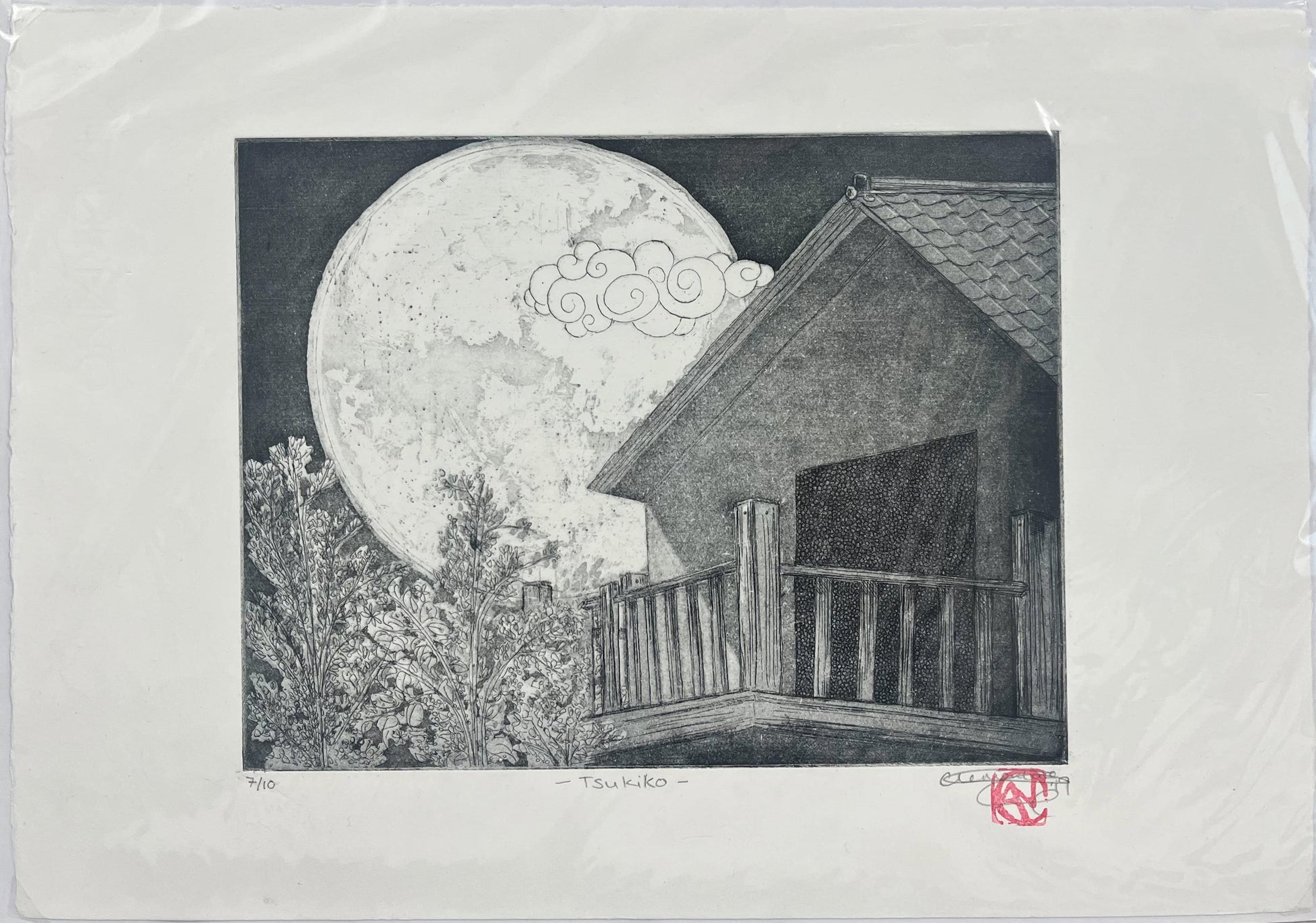 Tsukiko roughly translates as Moon Child. It is the final in a series of 3 prints inspired by the Tales of Princess Kaguya (Kaguya-hime no Monotagari) or the Tale of the Bamboo Cutter's Daughter. In 2015 I saw an adaptation of this by Studio Ghibli and fell in love with the story of the girl who was sent by Buddha and trapped on Earth only to finally be rescued and returned to the moon.